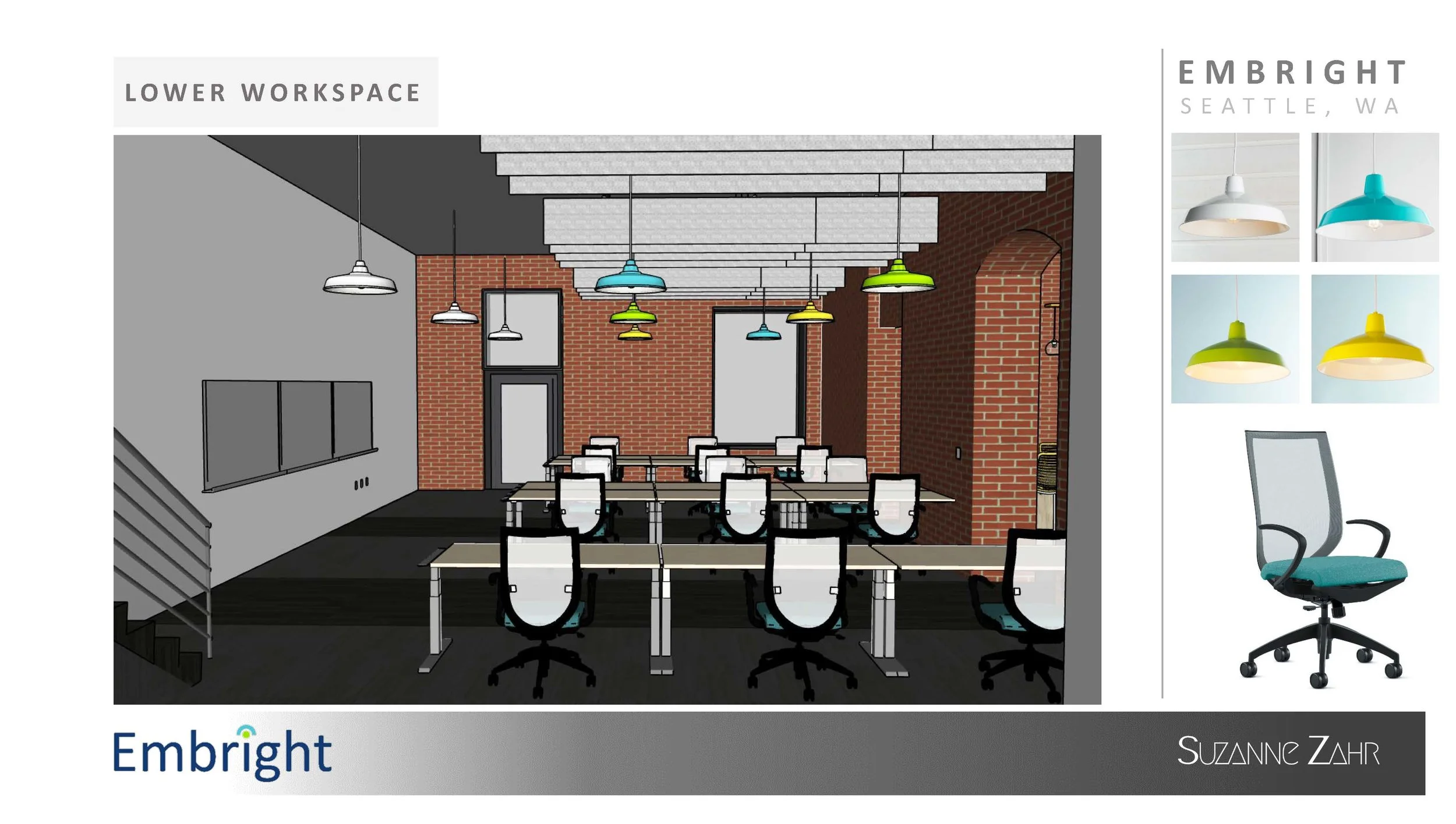 The SZ Team helped us to identify additional semi-private group work spaces and integrated elements to control for acoustics. Employees who experienced the space before and after the first phase renovation are energized and excited by the lighting accents, tone, and being surrounded by our branding elements. You feel subtly immersed in an ecosystem that reflects an integrated flow to our marketing and branding elements with our workforce. We continue to be intentional about trying out techniques in our workflow design to adapt to this unconventional corporate footprint and visitors and prospective hires are immediately exposed to a kinesthetic experience of who Embright is as soon as they enter the office.